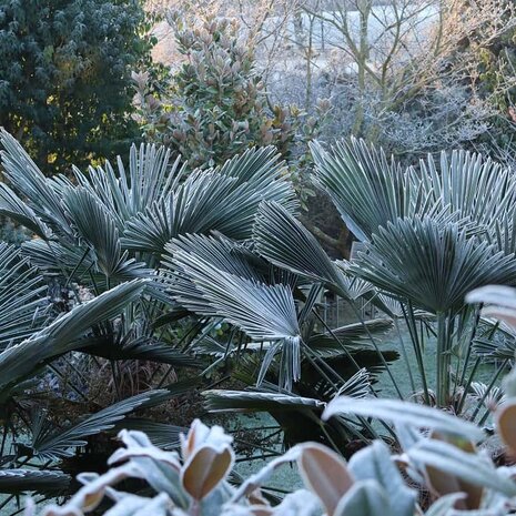 In Nordeuropa gezüchtet, ist die Frosty sehr widerstandsfähig gegen die meisten Winter, sie stehen nicht in Lehm, wordurch sie schneller neue Wurzeln bilden und schneller frostbeständig sind. Dies macht sie zu einer der besten Palmen für den Außenbereich. Sie sind bereits abgehärtet und werden weiterhin gut in Ihrem Garten wachsen. Dank der Auswahl nach der Steifheit der Blätter ist die Frosty auch besonders Wind resistent.